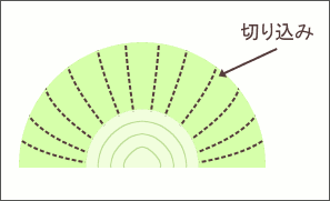 みじん切りを素早く行うコツはまずは玉ねぎを半分に切り、図のように根元にまで包丁を入れないようにして放射線状に縦に隠し包丁を入れます。そして横に切っていけば簡単にみじん切りが行えます。